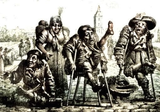 Cependant le cul-de-jatte, debout sur ses pieds, coiffait Gringoire de sa lourde jatte ferrée, et l’aveugle le regardait en face avec des yeux flamboyants. « Où suis-je ? dit le poète. – Dans la Cour des Miracles, répondit un quatrième spectre qui les avait accostés. – Sur mon âme, reprit Gringoire, je vois bien les aveugles qui regardent et les boiteux qui courent ; mais où est le sauveur ? » Ils répondirent par un éclat de rire sinistre.