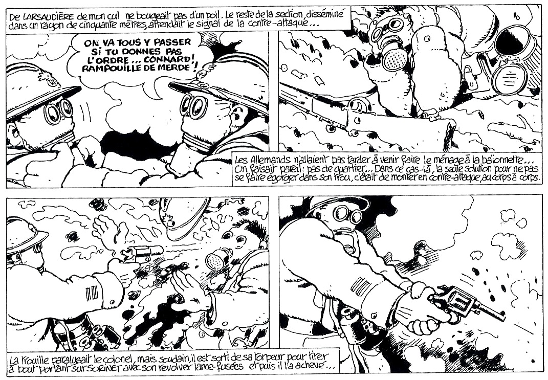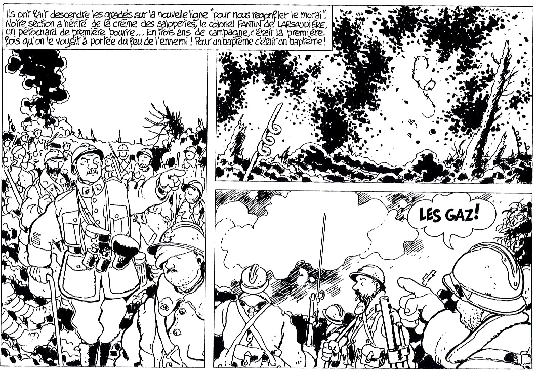 1) Quelle opinion vis-à-vis de la bataille le narrateur exprime-t-il dans le dernier cartouche de la 1ère planche ? Quel mot nous permet de le comprendre ?